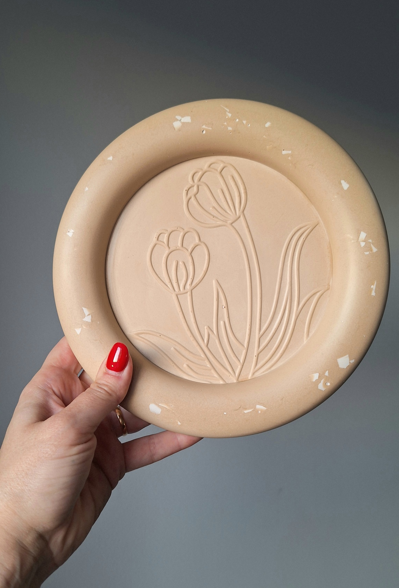 Dá aquele toque unico na decoração da tua casa com esta base redonda com desenho de tulipa gravado.